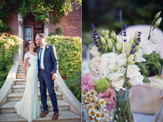 We love featuring destination weddings, especially those beautiful Venice weddings! Meet our bride and groom, Kaye and Craig. You may want to know a little bit about our couple: they’re both from the UK and English teachers. They wanted a destination wedding in Italy but were unsure about how to plan it. That’s when they contacted Jayne Seddon from Venice Events. Jayne and the team at Venice Events went over every detail and made their wedding a joy to plan. Jayne tells us, “Craig wanted from the very beginning, their wedding to be perfect for Kaye. They wanted an intimate and charming wedding that included 22 guests. The wedding occurred over two days starting with a civil ceremony in Palazzo Cavalli on the first day. On the second day at their lovely villa on the Lido island in the Venetian lagoon, I conducted a very special moving symbolic ceremony for Kaye and Craig. The wedding had a lovely literary theme, with their rings being presented on a first edition book of Alice in Wonderland by Kaye’s brother. See the rest of the story and the incredible photographs by Laure Jacquemin Photography after the click…