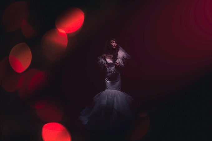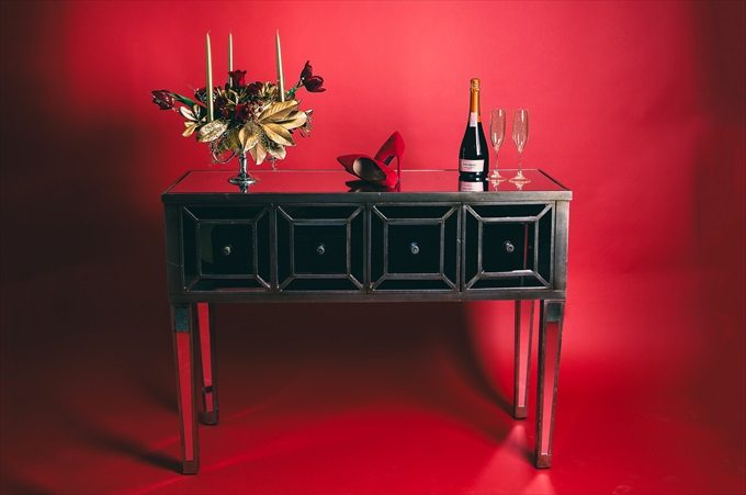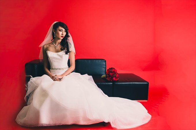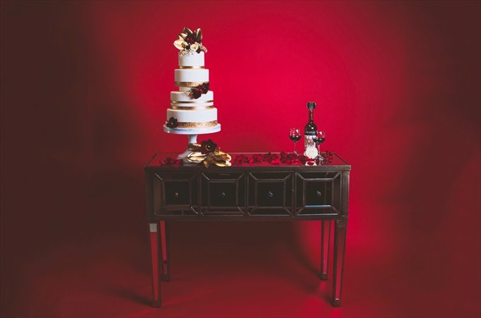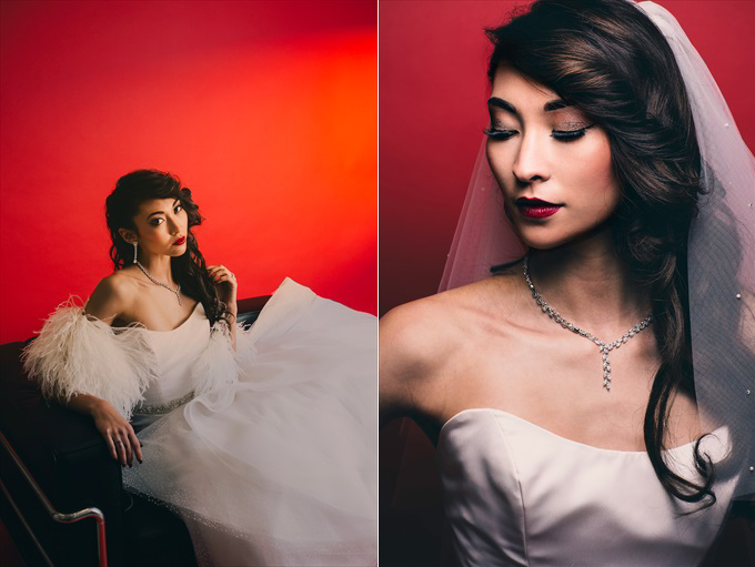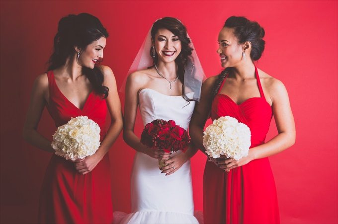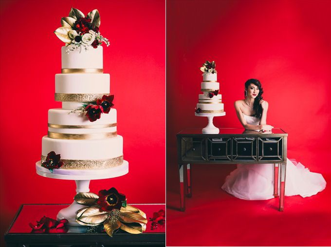 We are excited to share this incredibly modern and beautifully coordinated Vanity Fair inspired bridal shoot with you today! This styled shoot, photographed by Marcus Anthony Photography and styled by Jana Ingraham of Design A Dream Events — will have you imagining a bridal shoot of your own! It was designed with a red backdrop to pull in a Vogue / Vanity Fair inspired look, complete with ultra-modern lighting, furniture, apparel, and posing. The shoot features the bride and two bridesmaids, decked out in elegant red dresses to coordinate with the overall palette. In this Vanity Fair inspired bridal shoot, talented wedding vendors bring this vision to life including an elegant gold tiered cake (by Anna Echols of One Belle Bakery), a pair of stunning red heels (from Soul Shoetique), flowers by Desi Parker of Desi’s Floral Design, and hair and makeup by the talented Tyler Kent (of Tyler Kent Salon) and Britt Sharenow (of Beauty by Britt), just to name a few. See how it all came together…