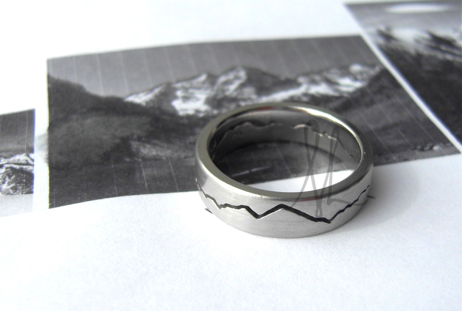 For the groom’s ring, consider something mountain inspired, like this from Peaces of Indigo: