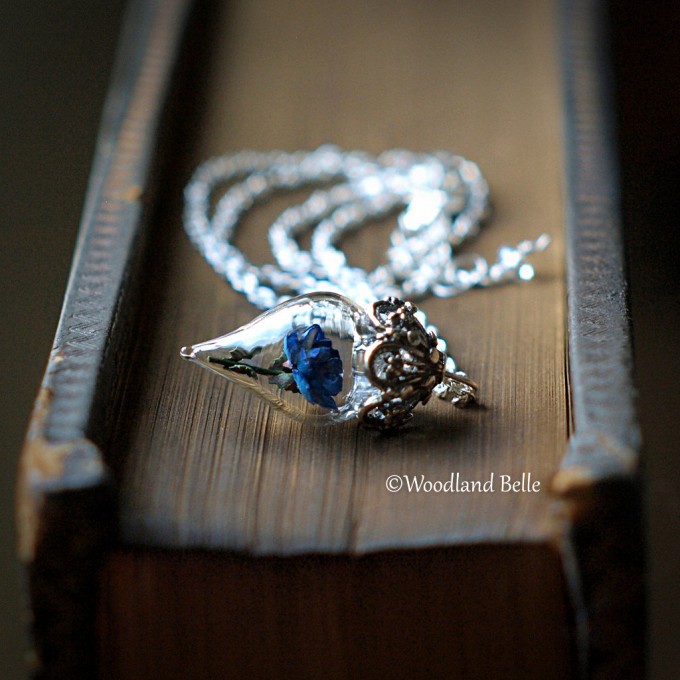 This romantic miniature rose necklace looks so realistic tucked inside a tiny glass terrarium vial. You may have seen a similar Beauty and the Beast rose necklace elsewhere, but this is the real deal (an original design). It features real hand-blown glass and measures 1″ in length and 1/2″ in width (including the cap). The sterling silver cap gives a vintage-inspired look. With freshwater pearls, an extender, and customizable rose color options, this rose necklace is truly one of a kind. Perfect for Beauty and the Beast fans, literary lovers, and vintage-loving fans of all ages.