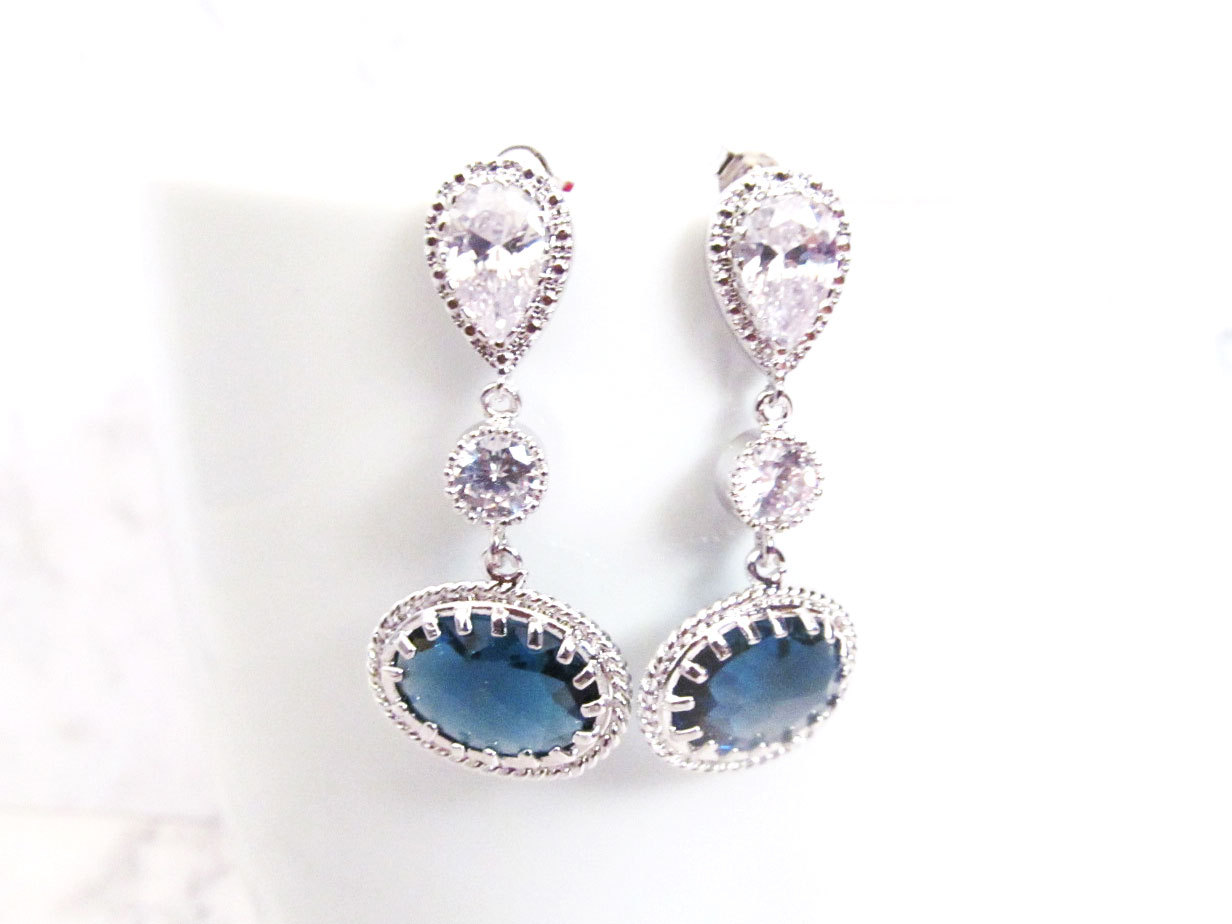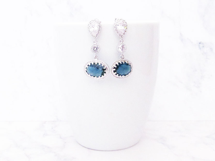 This pair of navy blue wedding earrings feature a vintage inspired design and a touch of glamour. They are made with rhodhium plated brass, dark navy blue glass drop, cubic zircon components, and have standard posts.