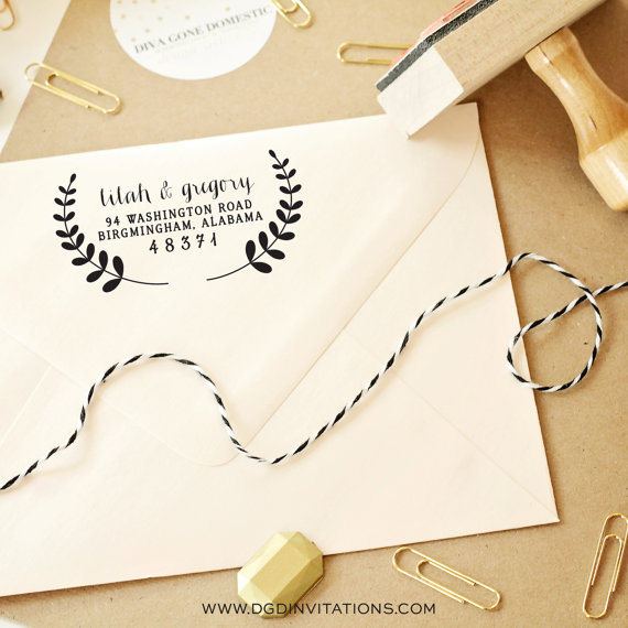 Would you like to save time on your wedding invitations? Of course! Everyone could use a little more time, am I right? That’s why we teamed up with the lovelies over at Diva Gone Domestic, an adorable shop that makes stylish rubber stamps and paper goods. We’re giving away a custom rubber stamp for wedding invitations, which means you can stamp all them with your return address and save yourself tons of time. No more printing labels and affixing one on each invite; or, heaven help us, hand-writing each one. Save yourself the handcramp and get yourself a stamp!
