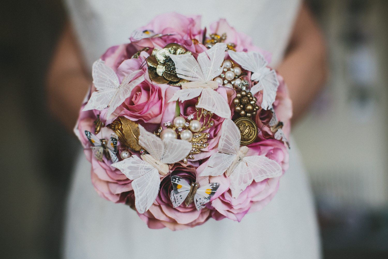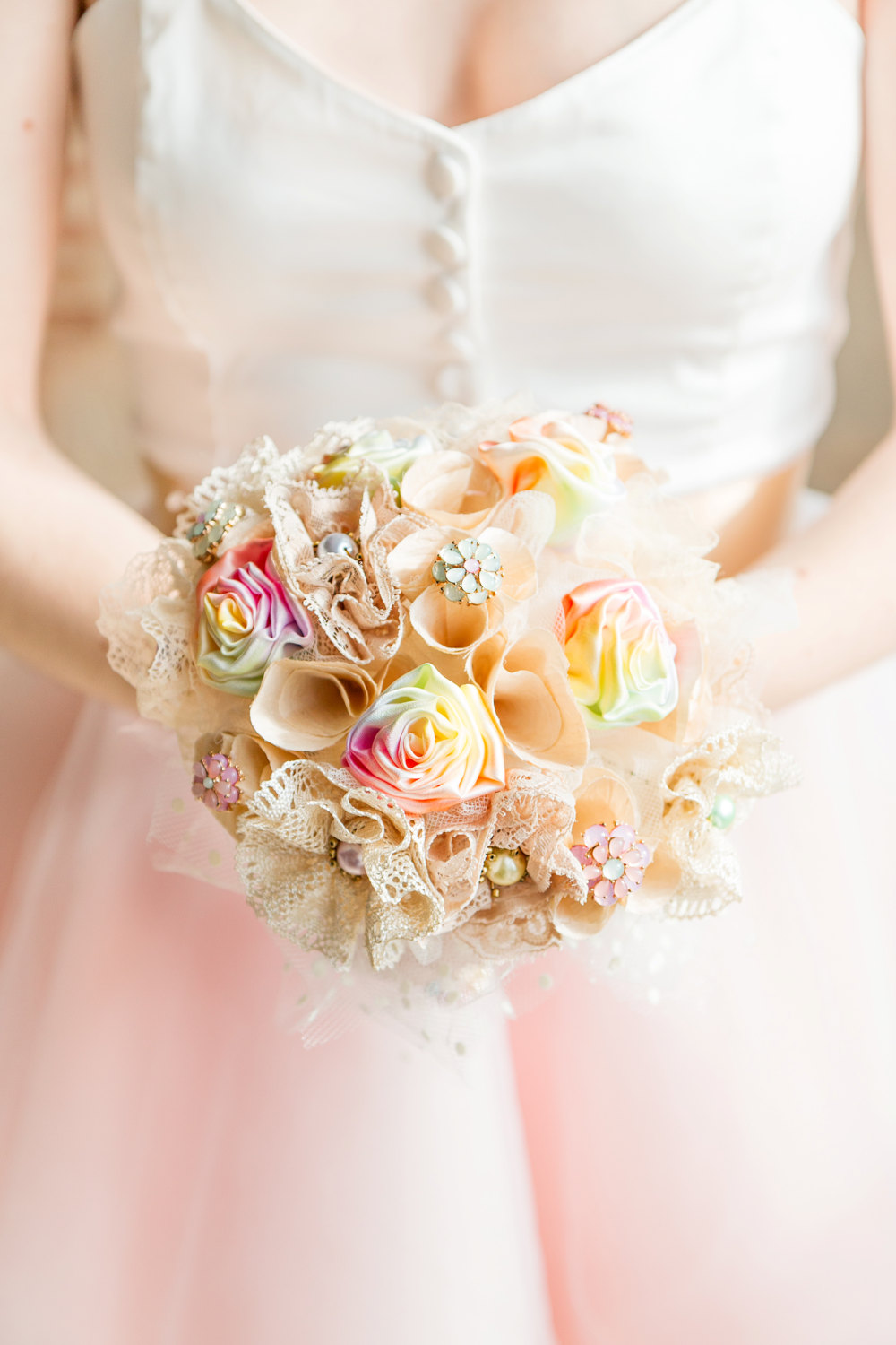 So, what do brides love about wedding bouquets without fresh flowers? For starters, an alternative wedding bouquet means you don’t have to keep your bouquet cool on a hot summer’s day. You don’t have to worry about the bouquet getting too cold on a cold winter’s day, either. You don’t have to worry about anything when it comes to these bouquets: no wilting, no petals drooping or breaking, and best of all, no needing to throw it away in the trash just a few days later! A wedding bouquet made of alternative supplies requires no water, they won’t break or wilt, and you never have to throw them away; in fact, many brides enjoy their bouquet on display in their home for years. Money well spent, we say.