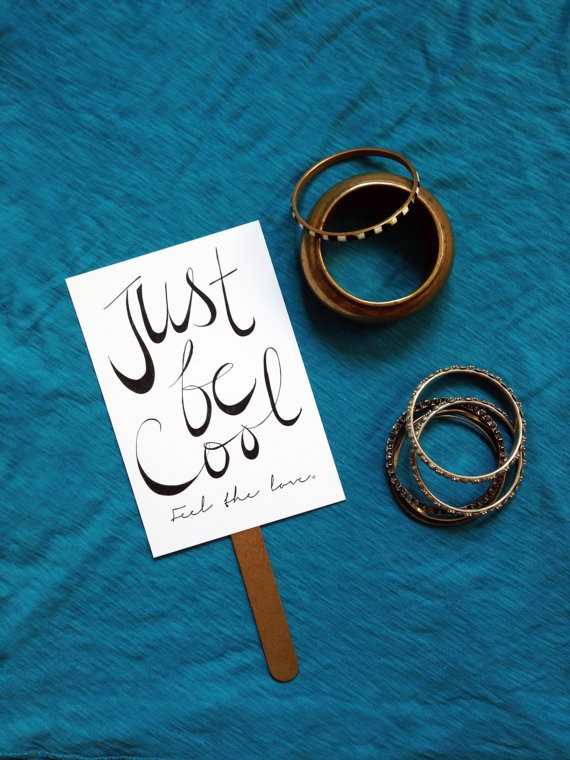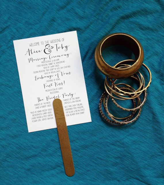 One reason (out of 1093493) why I love weddings so much is because no two are the same. Each couple, ceremony, and reception are remarkably different. While planning your wedding, keep in mind that no wedding detail is even *really* required. That’s the fun part of being the engaged couple: everything is completely up to you. For instance, do you ever really need to send save the dates? No. Do you have to wear a veil? Nope. Same goes for escort cards AND place cards. So, wedding programs are not required, but they can be helpful. They’re one of my favorite details because they can tie in your theme, entertain your guests (or cool ’em off with a fan style, shown below):