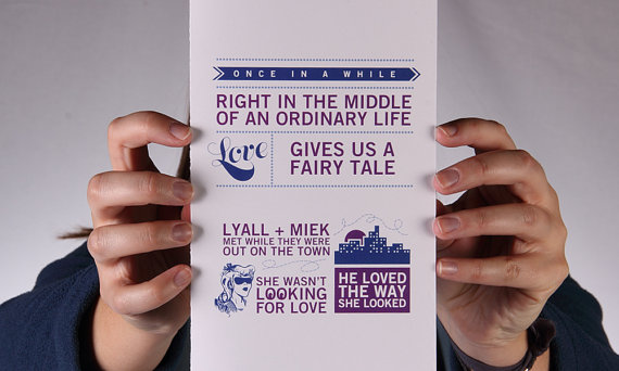 Get guests more acquainted with your unique story. These ceremony programs tell how you met, how + where he proposed, and even gives details about your wedding party!