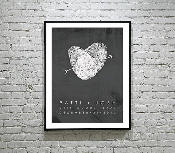 Happy Friday! Our giveaway series this month has been pretty awesome so far! I mean, at any given moment there are five or more items being given away to the coolest people on the planet (our dear readers) + handmade by the best artists in the biz! Does it get any better than that? Anddd…. we have another wonderful giveaway up our sleeve! Have you seen this unique fingerprint heart art made from your fingerprints? It’s a pretty neat idea by Flutterbye Prints that can be used as a wedding gift and/or a guest book alternative. This isn’t any fingerprint art, though: unlike others, this is made from your ACTUAL fingerprints. You send ’em in and Amie turns them into beautiful works of art! Read on to see some examples and enter for a chance to win one of your very own!