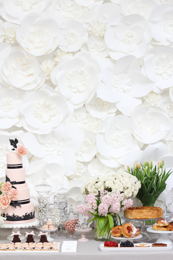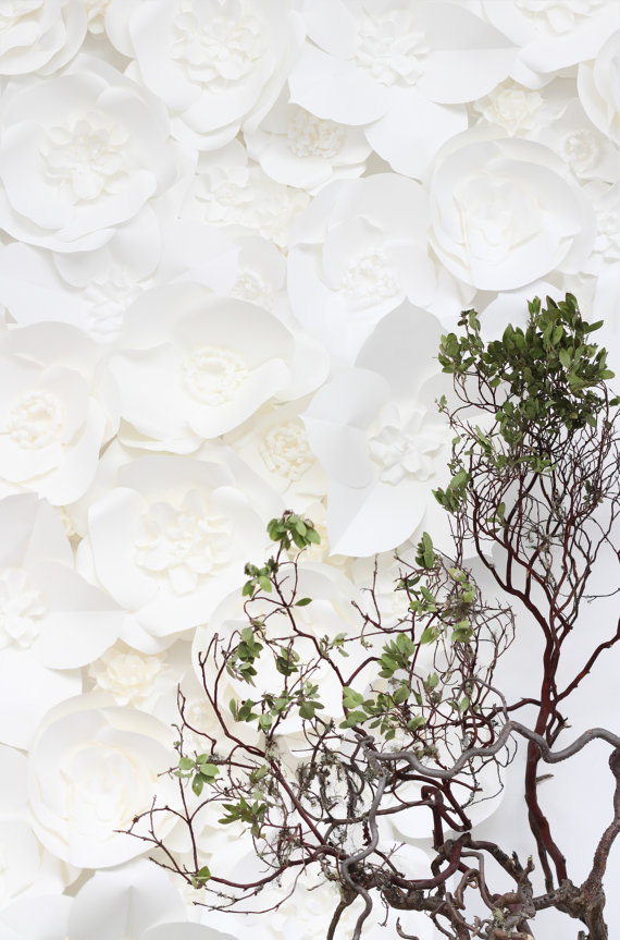 We’ve teamed up with the always-inspiring Chantal of Dragonfly Expression to give away a white flower backdrop to one lucky reader. The winner will receive large paper flowers to cover a surface measuring 4ft x 2ft. The flowers come in various shapes and sizes and are all handmade; flowers are white in color. Flowers range in sizes from 8 inches to 20 inches in diameter and are delivered ready-to-assemble. Need a larger backdrop than the prize of 4ft x 2ft? No problem: you can use this prize as $200 towards a custom size order. Read on for the full details!