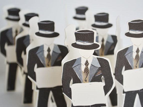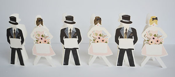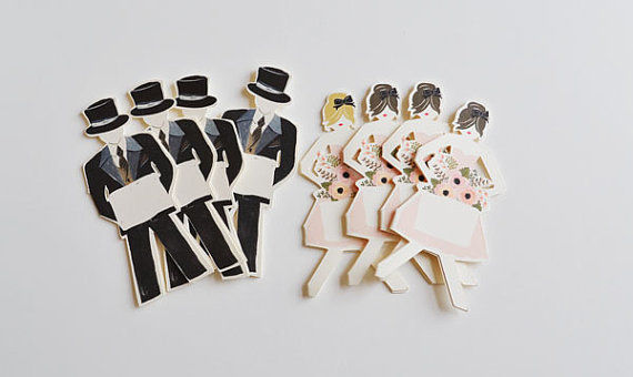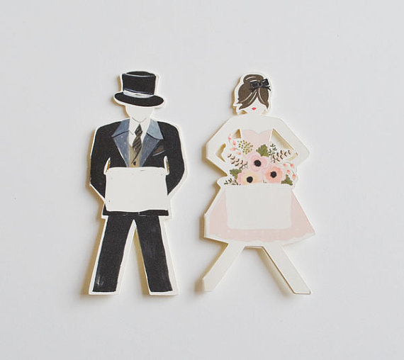 Whenever we find a unique idea for weddings — especially handmade details — we can’t help but share them. Immediately. For instance, we spotted these paper doll place cards over at The First Snow, maker of beautiful hand-painted illustrations (remember these?) And, suffice it to say, these sweet little paper doll place cards are one of our favorite new finds! You can set these at each guest’s setting for a unique + personalized touch. The card has a space made for hand-writing your guest’s name.