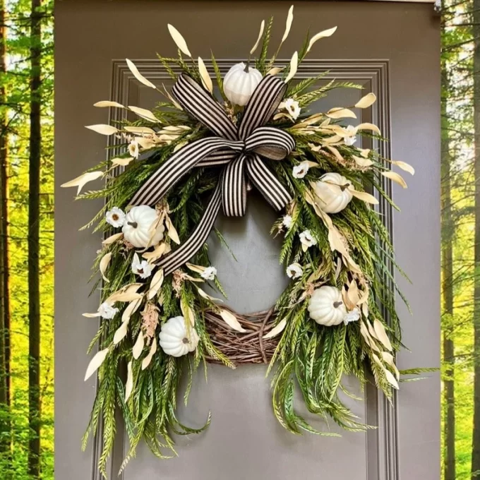 And finally, if you love mini white pumpkins as I do, this wreath is the perfect finishing touch to your fall foliage. By Kaleigh’s Wreath Decor.
