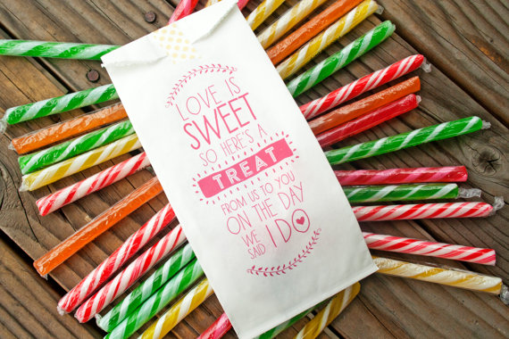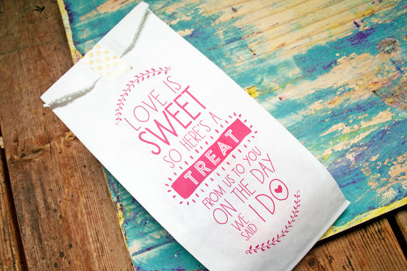 I love the “Eat drink and be married” lined bags, or the custom calligraphy ones – great way for guests to take home a slice of cake!