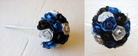 The wedding blue, ivory, silver, paper rose bouquet is stunning!!