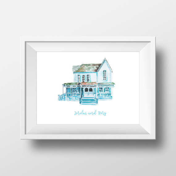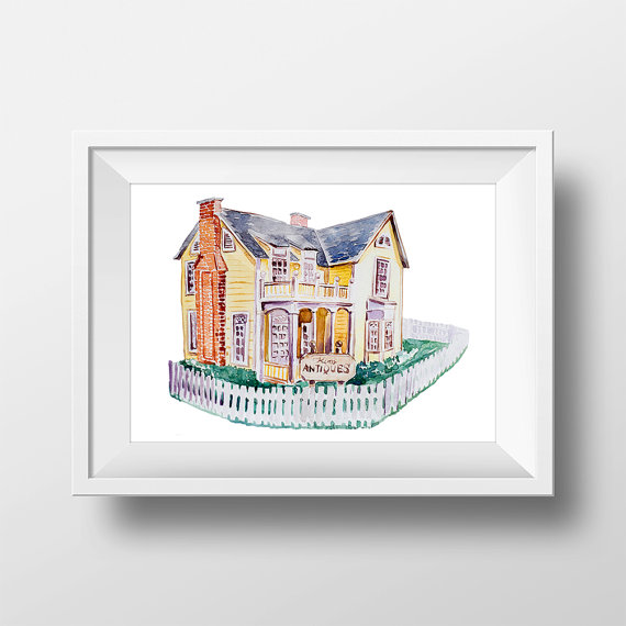 I want a gallery wall of these; there’s a Stars Hollow art print, Luke’s Diner / Williams Hardware, Lorelai and Rory’s House, and Kim’s Antiques!