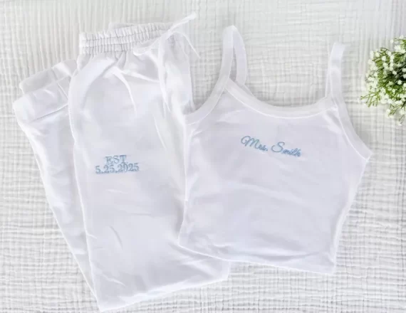 This bridal jogger set is super cute for the day-of and beyond! By Up2OurNecksinFabric.