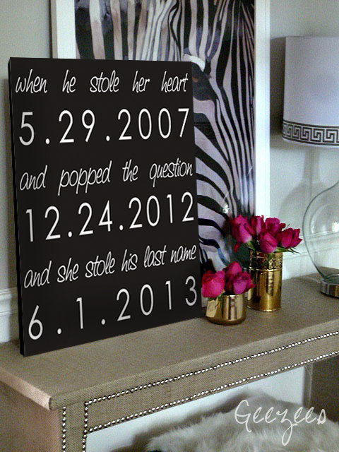 We love popping in to Geezees to see what’s new. One of our favorite new canvases just released is this one that features different dates to tell your story. For instance, it features the date he stole her heart, popped the question, and she stole his last name. Cute idea for a wedding present!
