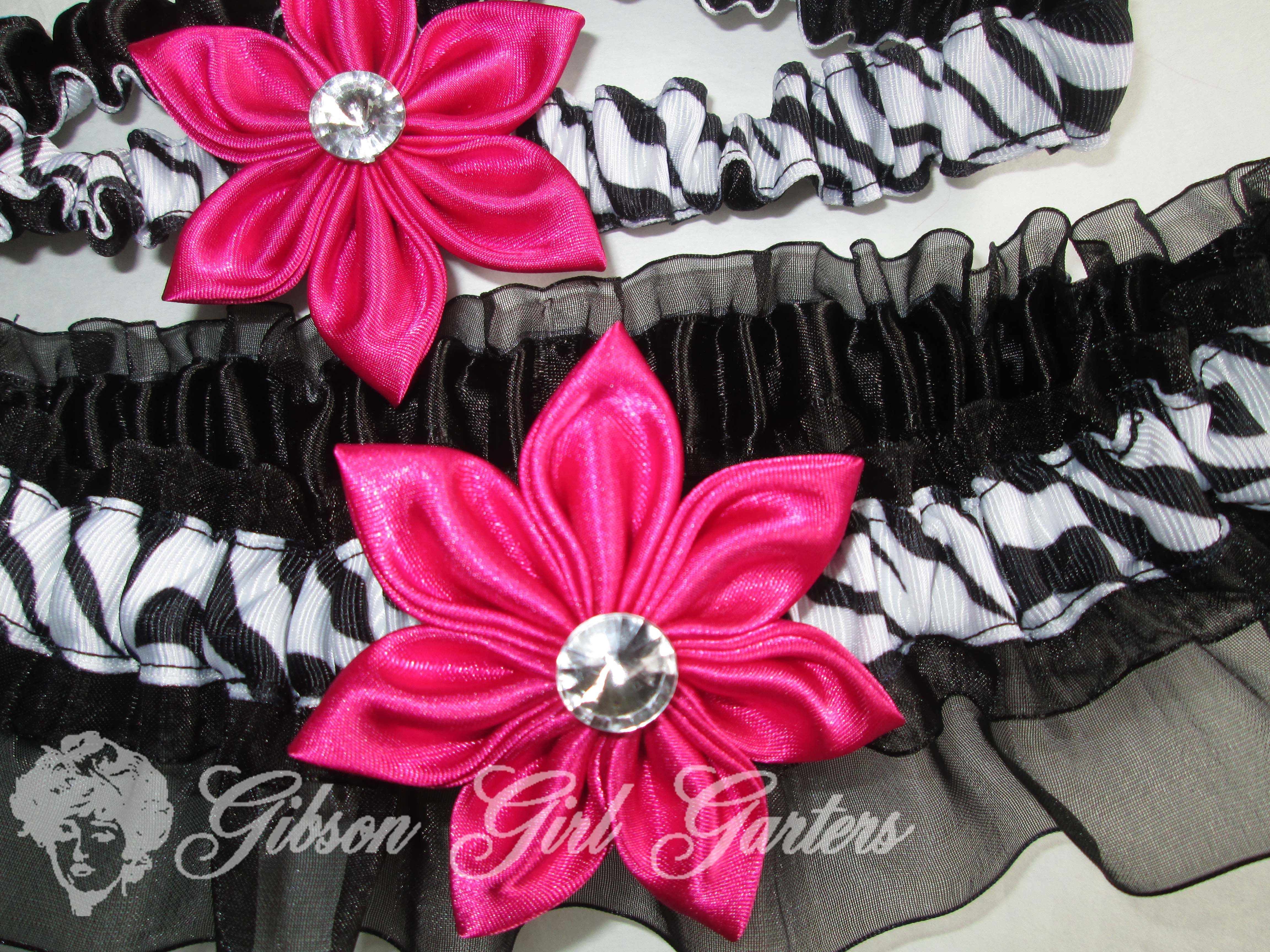 Zebra Wedding Garters, Black Organza Wedding Garters, Hot Pink / Fuchsia Kanzashi Flowers, Hot Pink Wedding Garters, Animal Print Garters