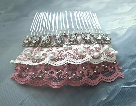 Bridal Lace Hair Comb. Lace Bridal Headpiece, Rhinestone Pearl Hair Comb, Bridal Accessories, Wedding Jewlery, Pink Ivory Lace