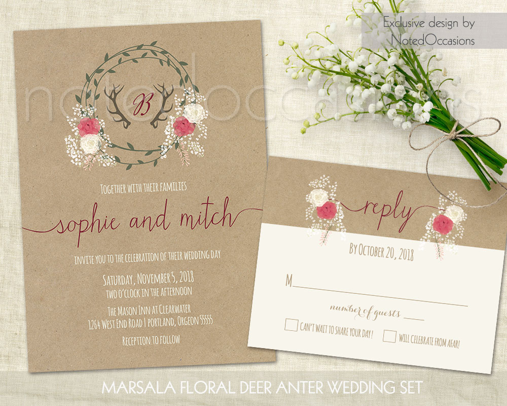 Rustic Wedding Invitation Printable, Deer Antler Wedding Set Printable Wedding Marsala Floral Babys Breath Country Wedding Digital Template