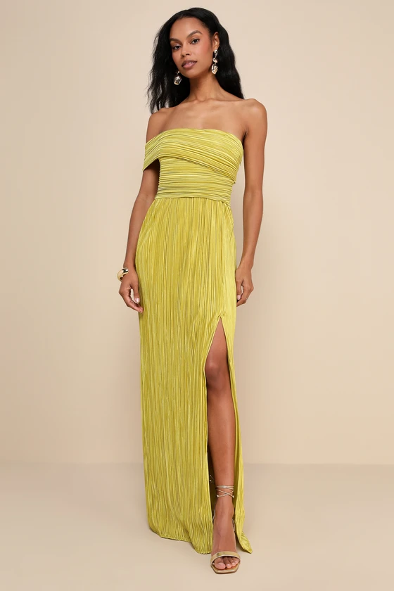 7. Chartreuse Plisse One-Shoulder Pleated Gown