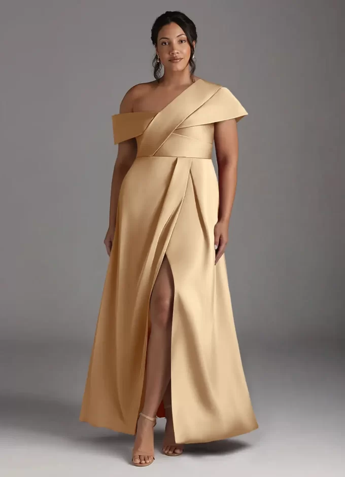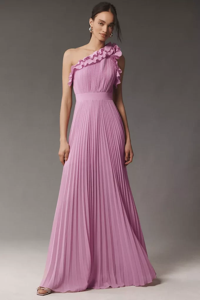 A gown like this for the Mother of the Bride is a beautiful choice! I love the ruffled one-shoulder neckline and long-length skirt. So elegant! By Lulu’s.