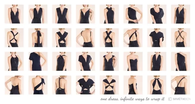 One jumpsuit, multiple ways to wear it! This is a dream come true for bridesmaids because they can wear it again and choose the style that flatters them best. Also by Mimetik.