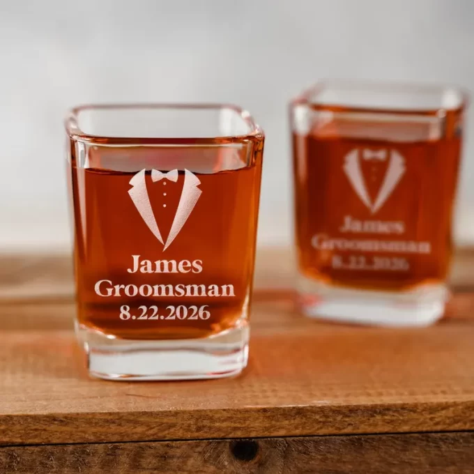 For a budget-friendly groomsmen proposal, you can’t go wrong with an engraved shot glass. By LaserSoupGifts.