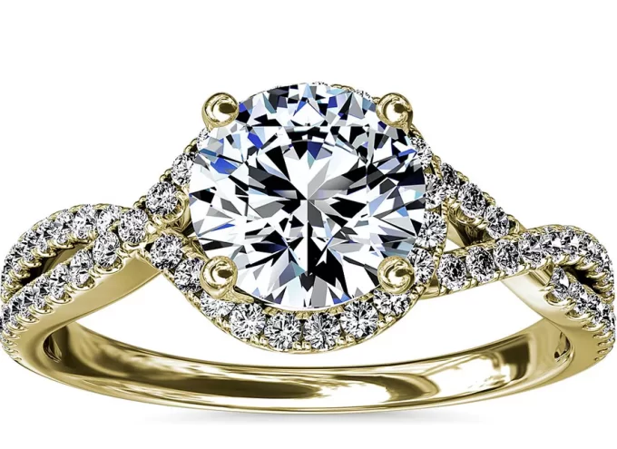 Specs – Price: Starting at $1,600 // Metal Type Shown: 14k Yellow Gold // Sizes available: US 3.5 to US 8.5 // Diamond Shape: Halo // Carat: Total – 0.34 Ct.