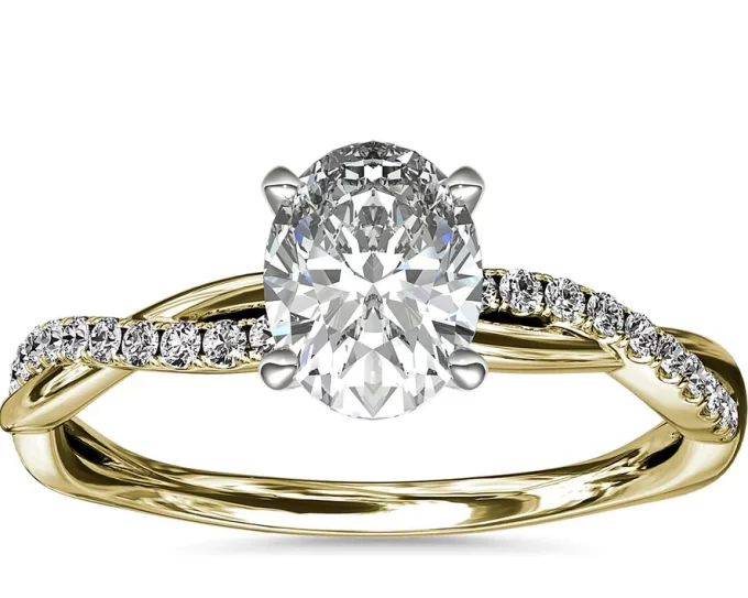 For a classic bride-to-be, this is a showstopper! A classic choice, this oval diamond ring features delicate pavé-set diamonds and a center diamond of your choice. Shown with 14k yellow gold option. See it here.