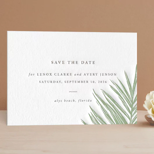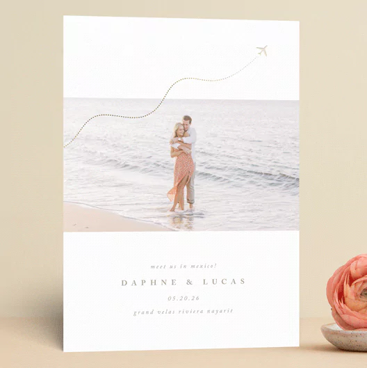 Words like, “Meet us in Mexico” is a nice touch, as well as an airplane motif for added charm. This card by Olivia Raufman is a great choice: it includes both! You can edit the save-the-date card to reflect your destination.