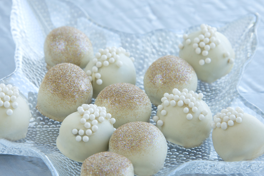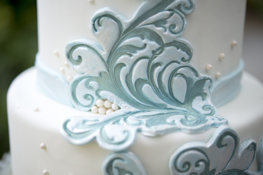 Sculpted waves and opalescent pearls look so fluid cascading on the wedding cake, alongside the lustrous pearl shaped white chocolate truffles, both created and designed by Cakes Made M.E.