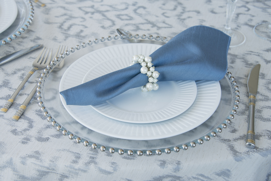 Your Moments – Wedding & Event Planning styled the elegant sweetheart table with items from Pleasanton Rentals. The use of light blue linens, pearl napkin rings, white plantation design plateware, silver mercury glass with glowing candlelight, classic crystal and elegant flowers all looked enchanting and harmonized with our inspiration design of seaside meets classic Hollywood.