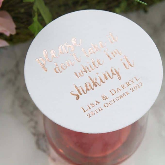 A wedding coaster can be used as a drink saver, when placed on the rim of a glass. This coaster reads, “Please don’t take my drink, I’m dancing“. I swear, the number of drinks “cleaned up” while people are dancing is incredible! It will save you money, too, as a bonus, since most guests go get a new drink when they discover theirs is gone.
