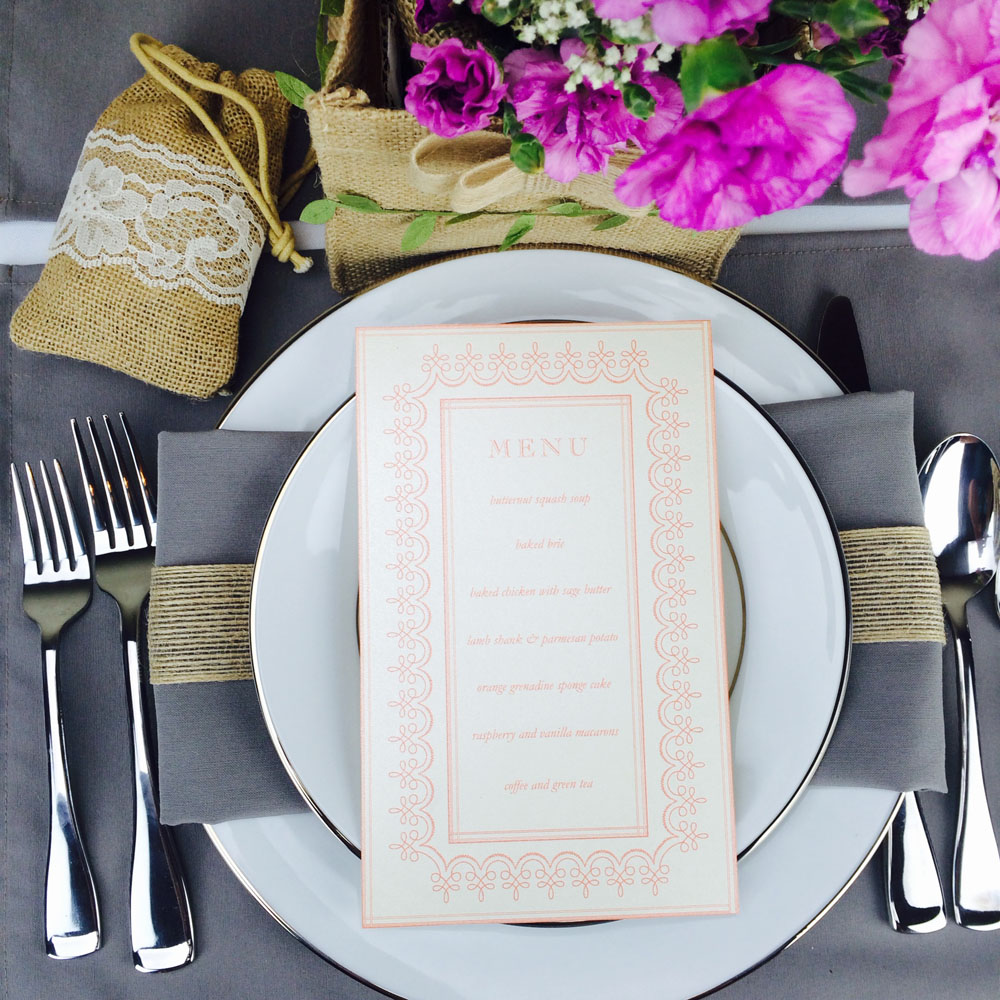 Use stylish, small details to spread your theme throughout the wedding. Use colored jute twines, jute rope, white chantilly lace, and natural burlap ribbon to tie, bundle, and thread everything from cloth napkins to wedding favors.