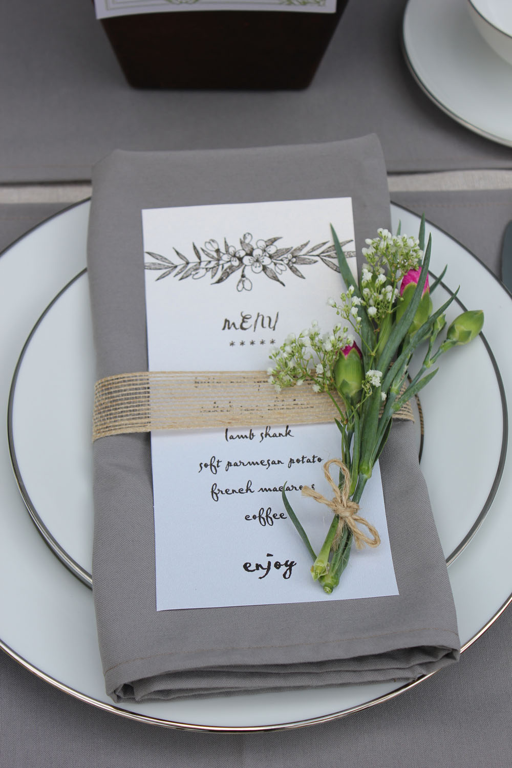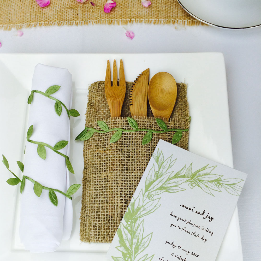For a more culture-infused place setting, use burlap pouches to create cutlery holders. Shown here is an Asian-themed wedding.