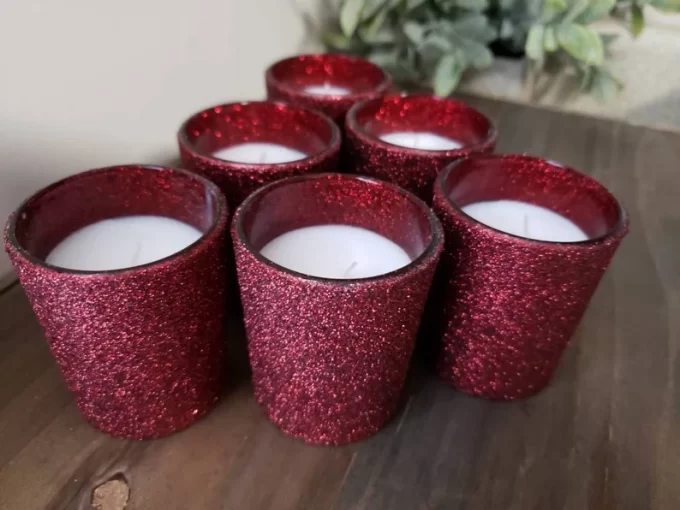 Make sure you use these bulk candles for your wedding. They’ll look great in these glittery burgundy candle holders. By SparkleInYourLife.