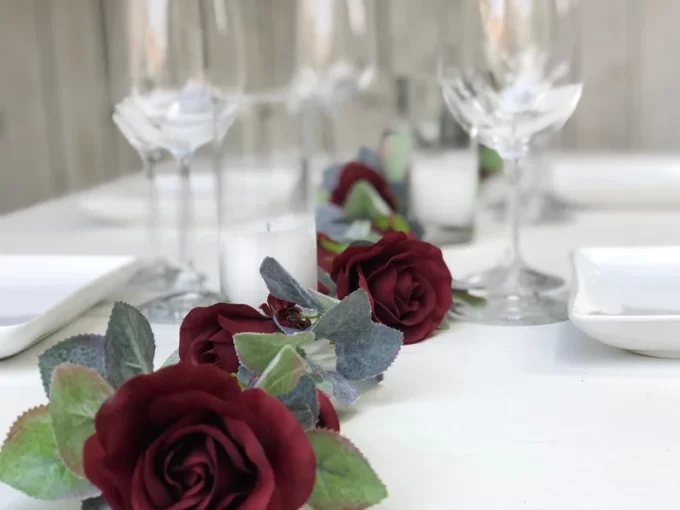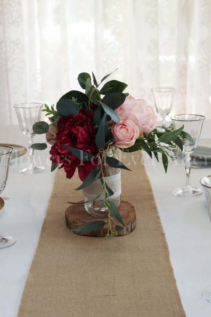 29. Decorate tables with these faux burgundy flower centerpieces in mason jars