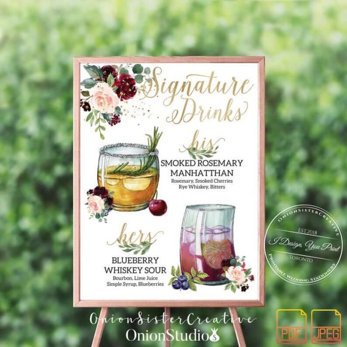 It features a pretty design with burgundy and blush pink flowers, along with your names and wedding date. By BlushingDrops.