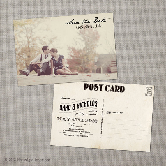 Great question! We absolutely adore these vintage save the date postcards, which are made from your own engagement photo and touched up to be given a more nostalgic, vintage-y look. These are by Nostalgic Imprints, a print shop that specializes in some of the most unique save the dates on the market. Here, take a look!
